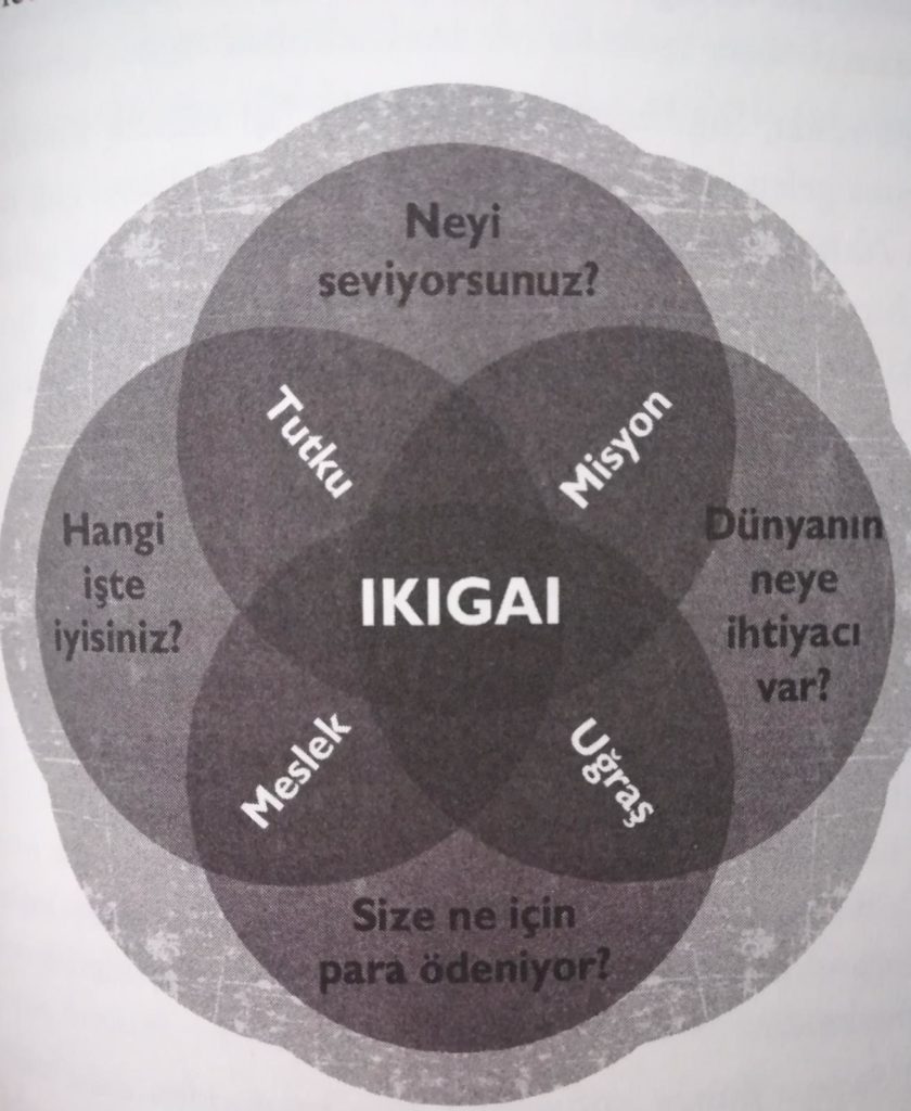 Kitaba adını veren İkigai kitapta uzun uzun anlatılmış ve bunu bir şemayla özetlemişler.